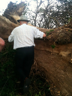 In the afternoon, we did more work on the fallen tree - not Dave, he went home after his sausages and chips. I separated the logs cut on Sunday from the ivy cut off on Sunday and piled the latter, ready for a bonfire. Then I went round to the root end and cut away rotten wood and cleared stones and earth, so that our friend had a clear area to cut with the chainsaw. It was really hard work and is taking a long time. I was pretty tired after a couple of hours, and covered with scratches and prickled by thorns. I went in for a shower. I'm not fond of showers, but needs must. I was going out to dinner and I was filthy and dusted with sawdust.