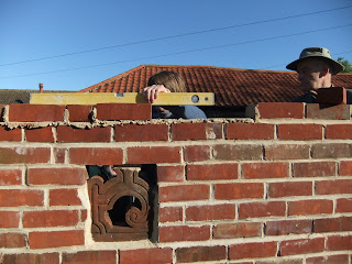 There was excitement as I was nearing the last brick, and Weeza got out her camera and the Sage hopped up on the scaffolding next to me. I was agitated. I wanted to concentrate on getting it right, and it wasn't right. In every section, we've worked on the pillars first and then joined up in between and it's worked out fine, with level brickwork, but this time it wasn't. The Sage took the spirit level from me and held it - "no, it's okay, look." I pointed out that he was holding the right end of the spirit level above the height of the bricks. It wouldn't do.